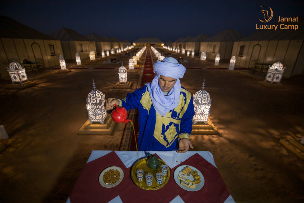 Jannat Luxury Camp es un encantador campamento del desierto en el medio del desierto del Sahara que ofrece excelentes servicios y diferentes opciones en dos tipos diferentes de carpas; Carpas de lujo que ofrecen un servicio de alto rango, con habitaciones privadas, baños privados y baños, y una excelente calidad de comida. Carpas estándar con buenas carpas comida, baño común. Le ofrecemos una buena variedad de actividades en el desierto. Para unas agradables vacaciones en el desierto del Sahara, estaremos encantados de compartir momentos agradables en su estadía en Jannat Luxury Camp. Aquí, tendrá un buen descanso después de su gran experiencia explorando el país. Jannat Luxury Camp presenta una magnífica combinación de un estilo tradicional marroquí con una decoración contemporánea. Jannat Luxury Camp es uno de los campamentos más bellos y encantadores del desierto.